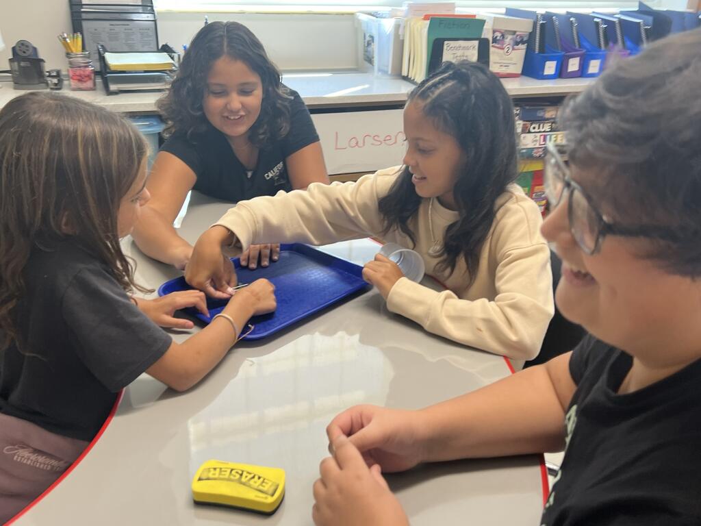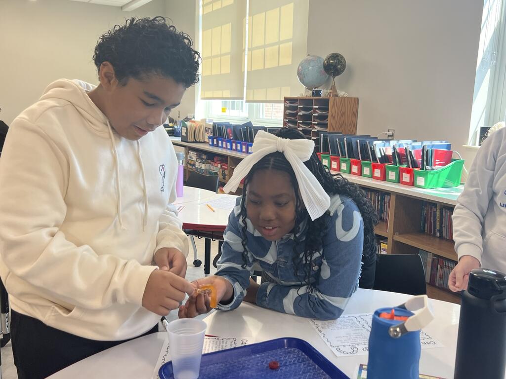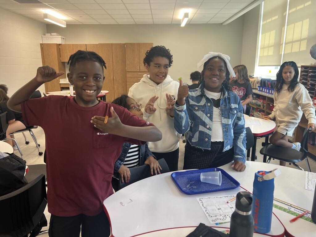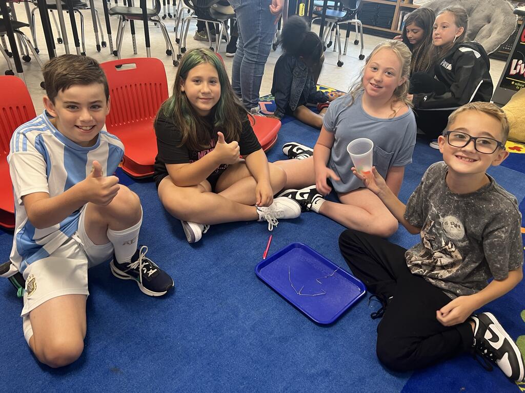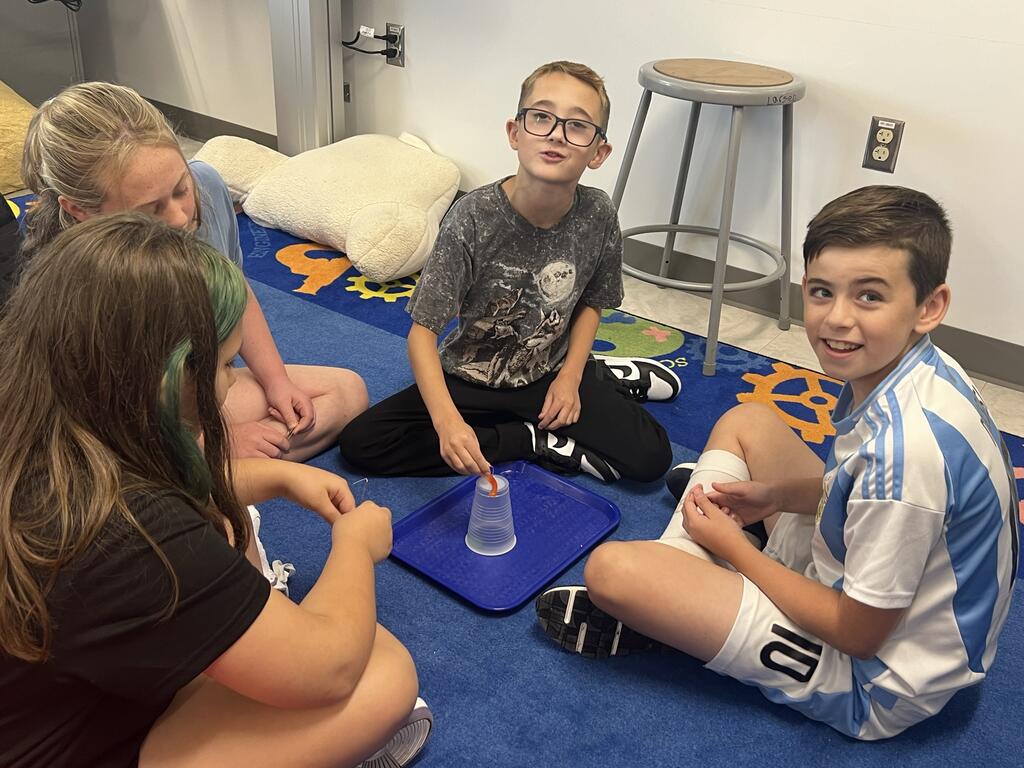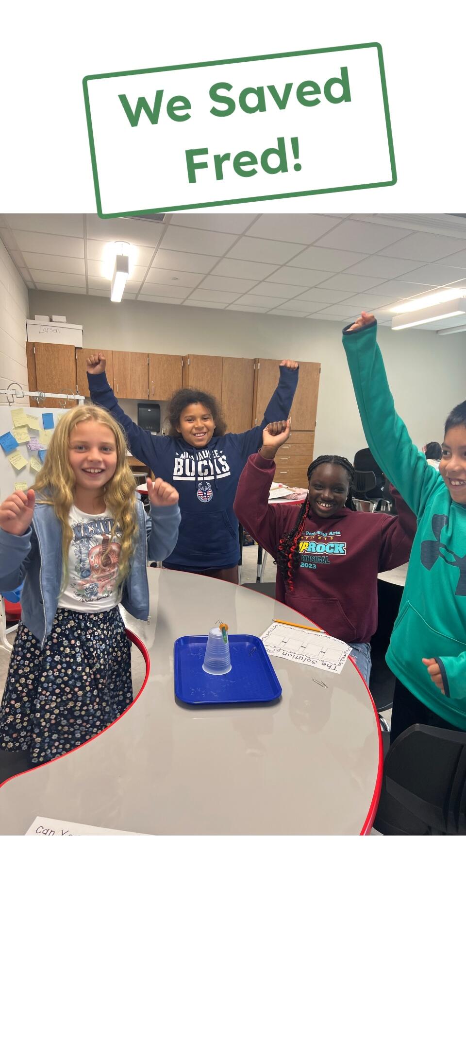 Students in Mrs. Larsen's class at East Main Elementary participated in a team-building activity called Save Fred. Four students work together using only paper clips (no hands) to save "Fred" the gummy worm and place him back in his life preserver.