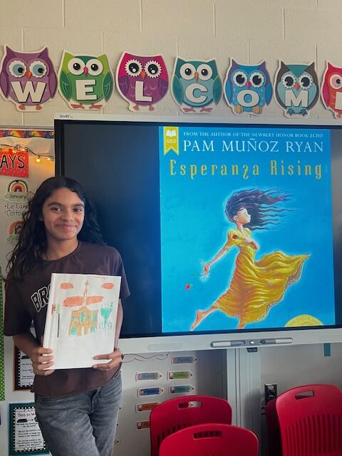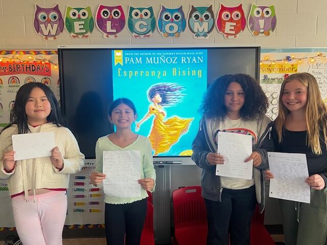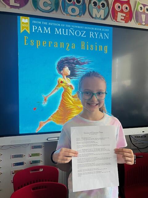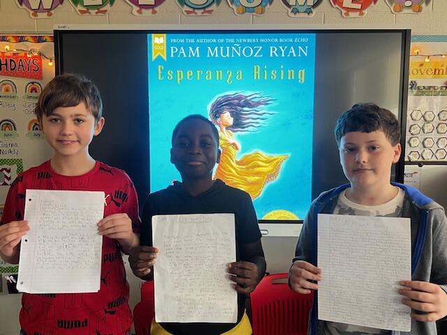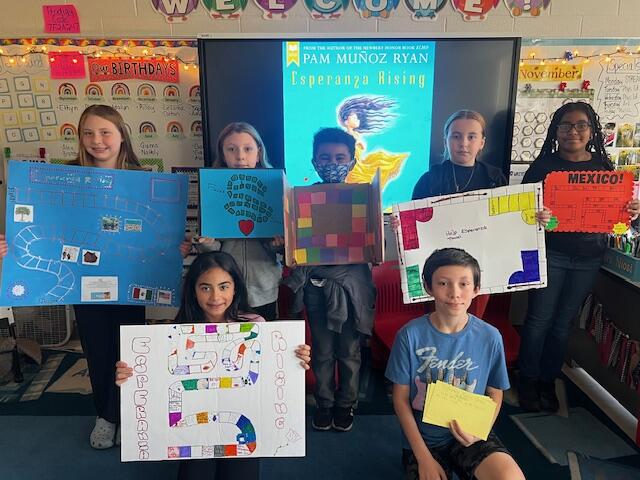 Mrs. Niosi's 5th-grade class at East Main Elementary School completed very creative culminating Esperanza Rising projects! The class recently completed a novel study on the book Esperanza Rising by Pam Munoz Ryan. After discussing important themes of the text, the class was given a project choice board and was able to pick what project appealed to them the most. The students completed a variety of projects from songwriting, creating a book trailer, writing alternate endings, illustrating a picture book based on the novel, writing a letter to the author, interviewing a main character from the book, and even designing and creating a board game that focuses on the novel! The students really enjoyed completing the projects! They also loved sharing their projects with each other and playing each other's board games!