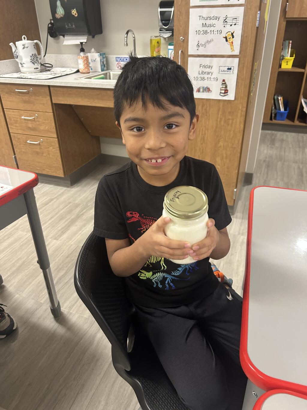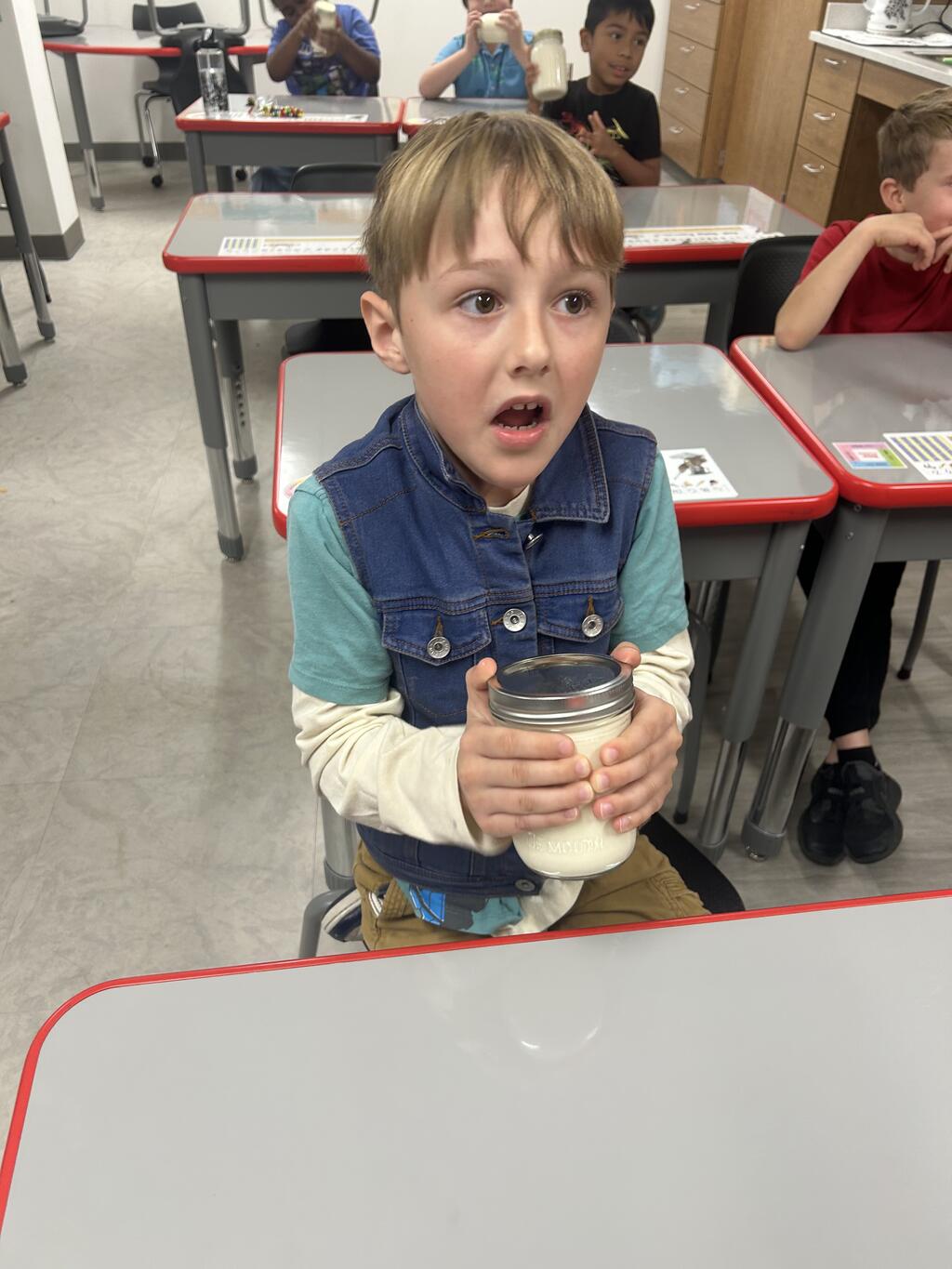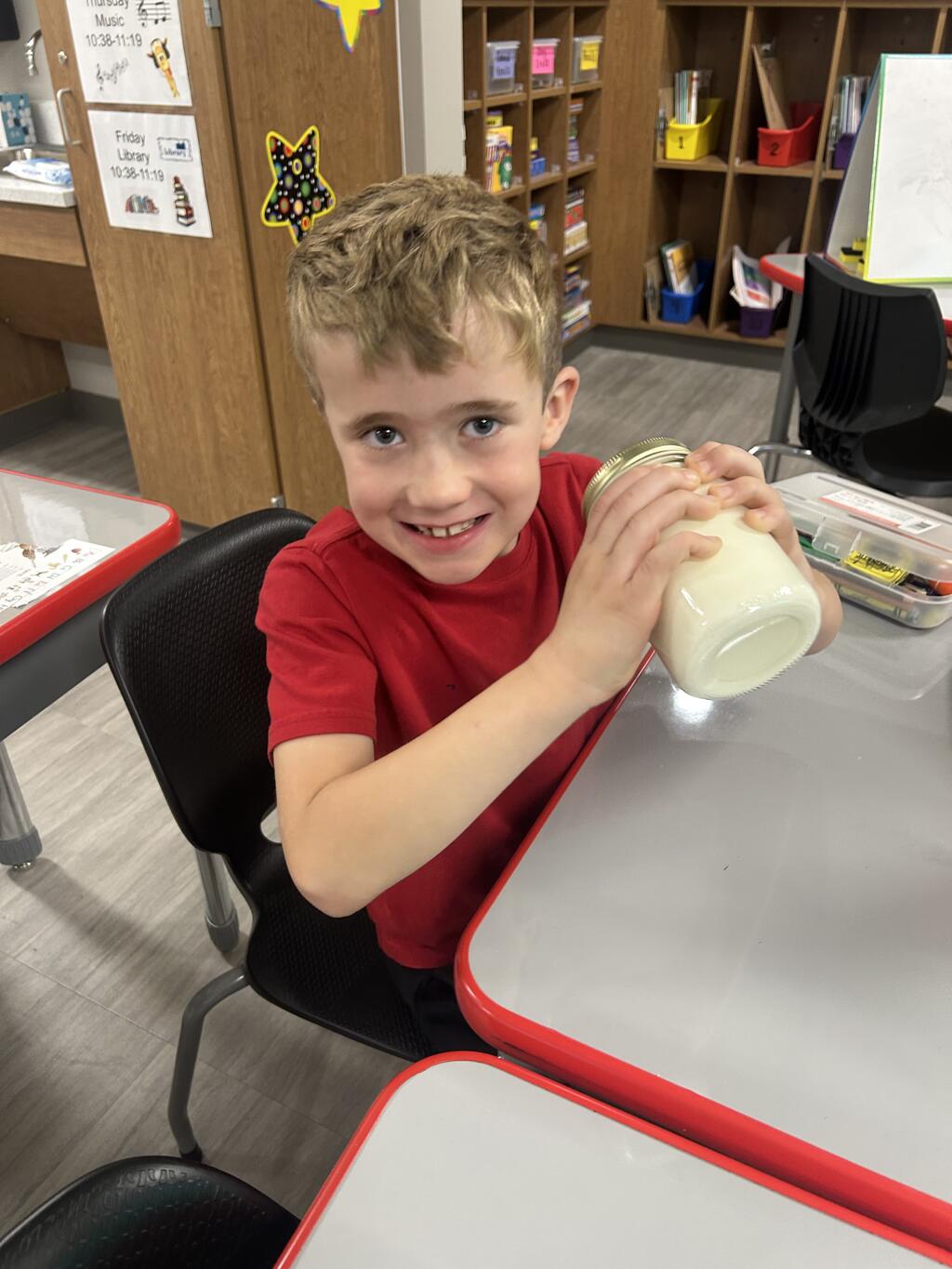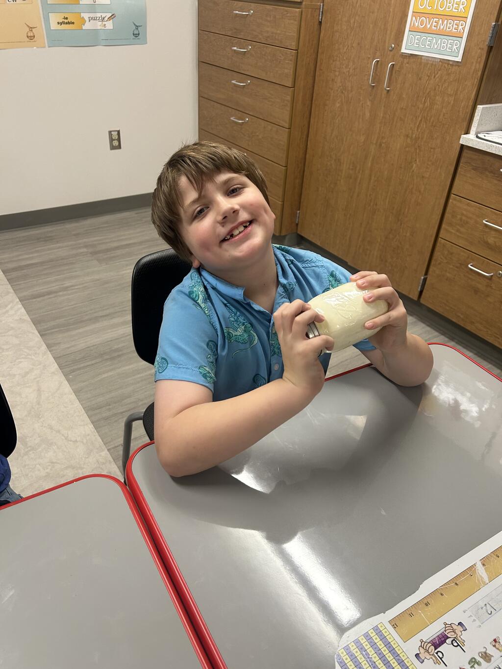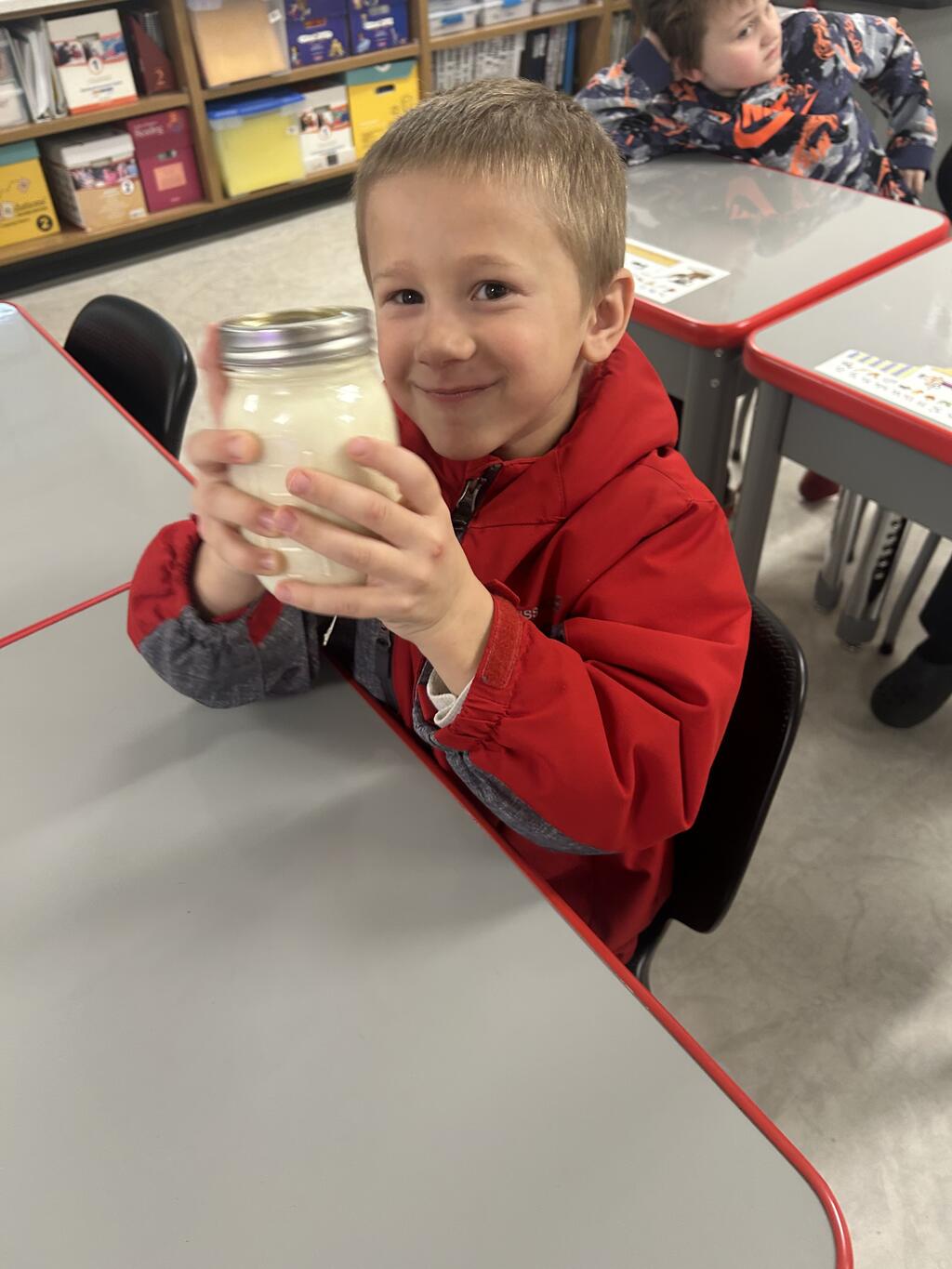 Ms. Cody & Mrs. Fogarty’s 2nd Grade class at EME made their own butter (regular & cinnamon)! They’ve been learning all about states of matter and observed a liquid changing into a solid during this delicious experiment! After they took turns churning and shaking the heavy cream and salt mixture, butter was formed. They enjoyed their creation on a piece of toast while they watched Charlie Brown’s Thanksgiving; eating Snoopy’s feast of toast, popcorn, jelly beans, and pretzel sticks! A Happy Thanksgiving to all!