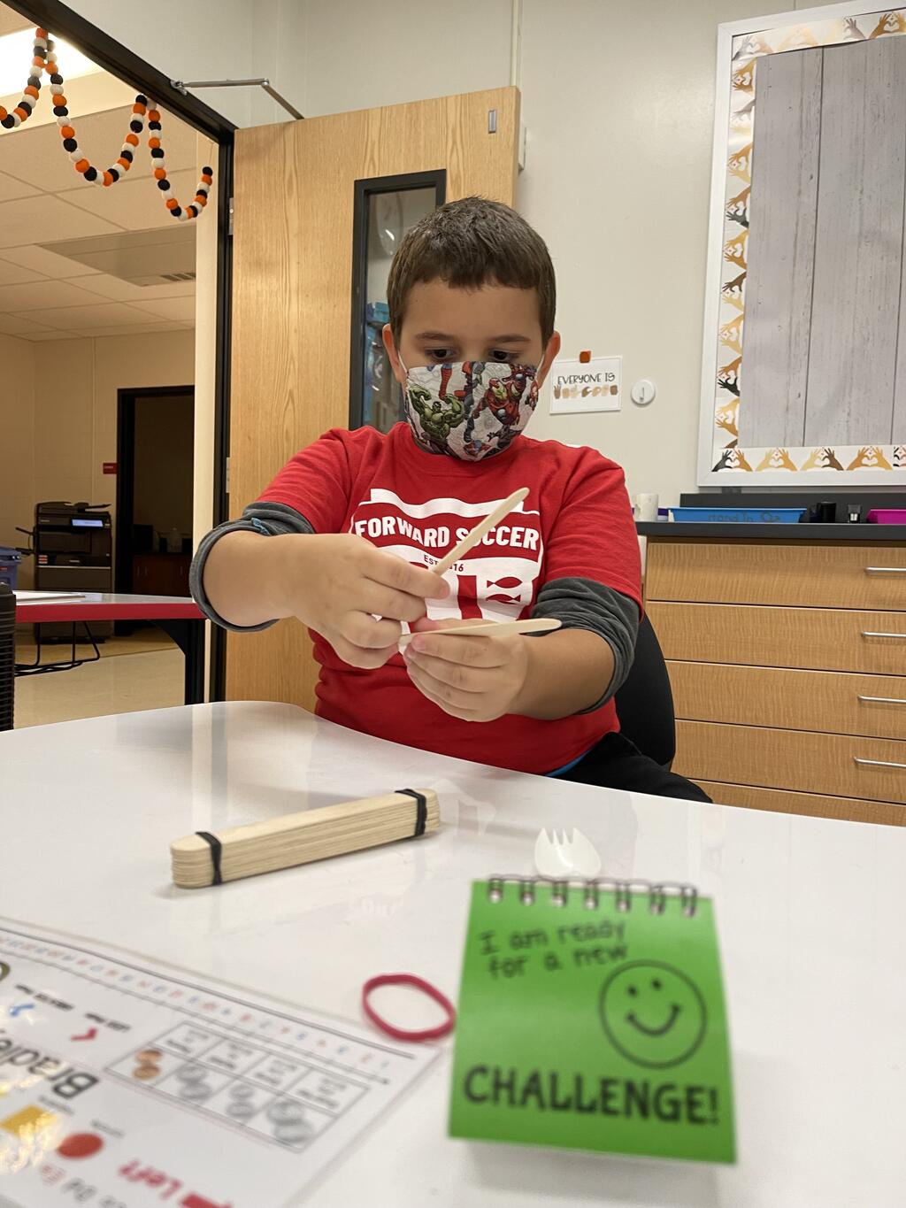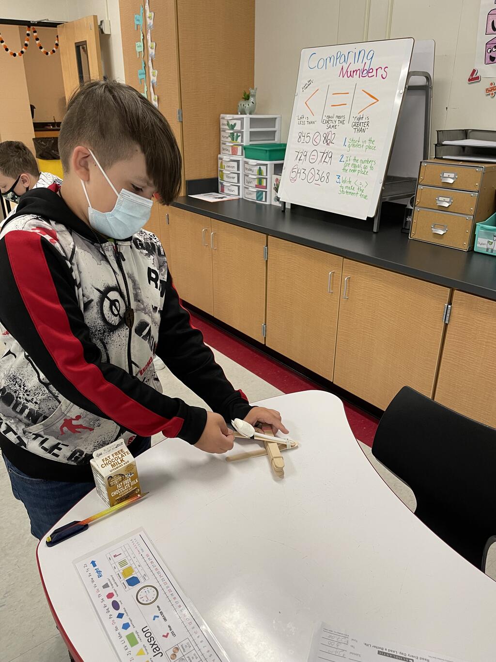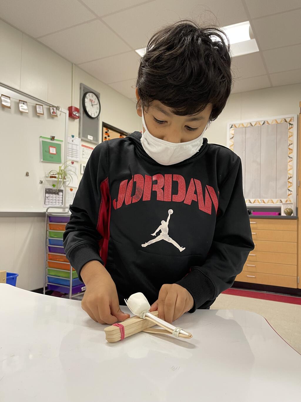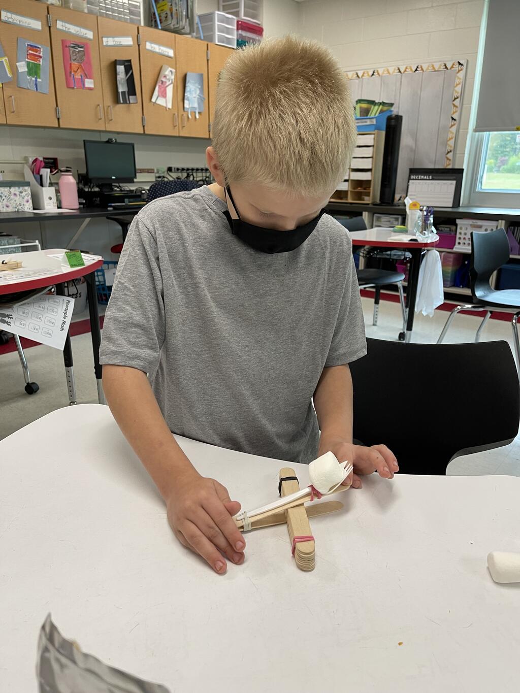 The students in Ms. Monahan's third and fourth-grade class experimented with simple machines today. The students created catapults (levers) to launch marshmallows. They experimented with the force and positioning of their popsicle sticks to send their marshmallows across the room!