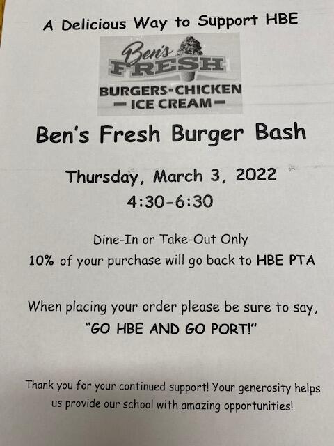 Take a night off from cooking and come support HBE PTA at Ben's Fresh on March 3rd!!!