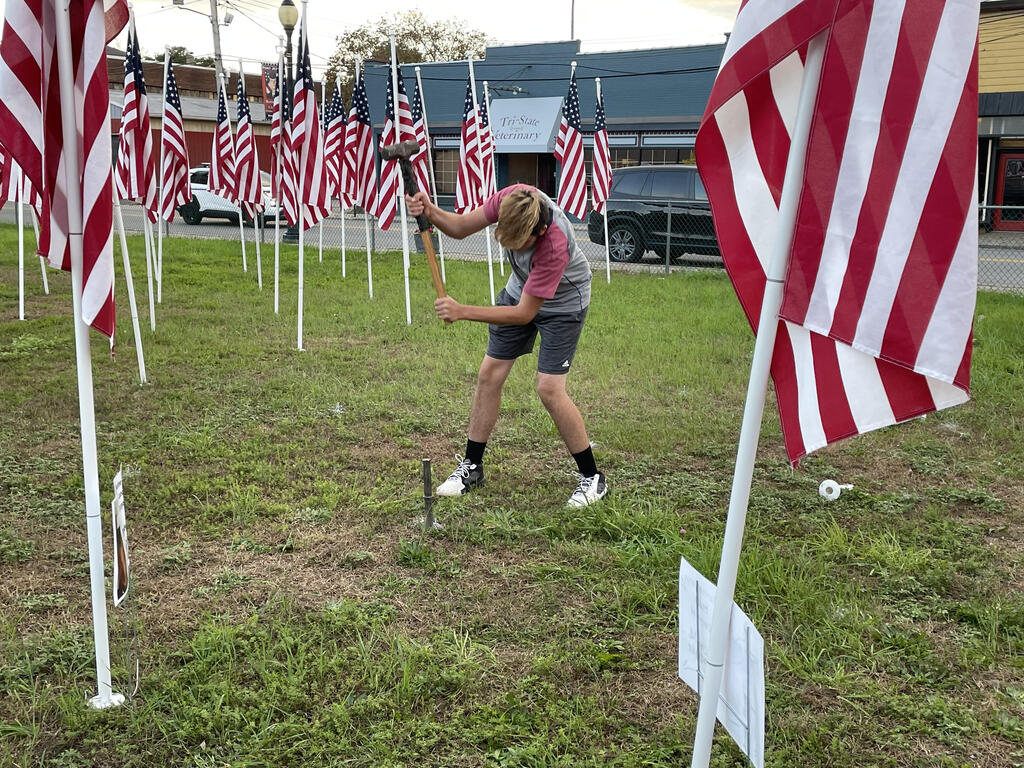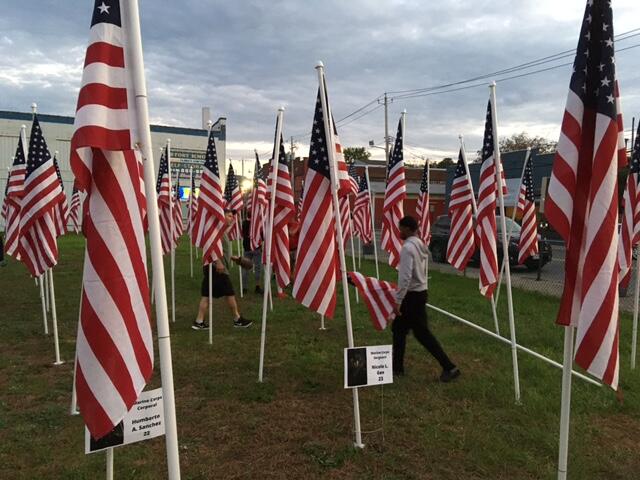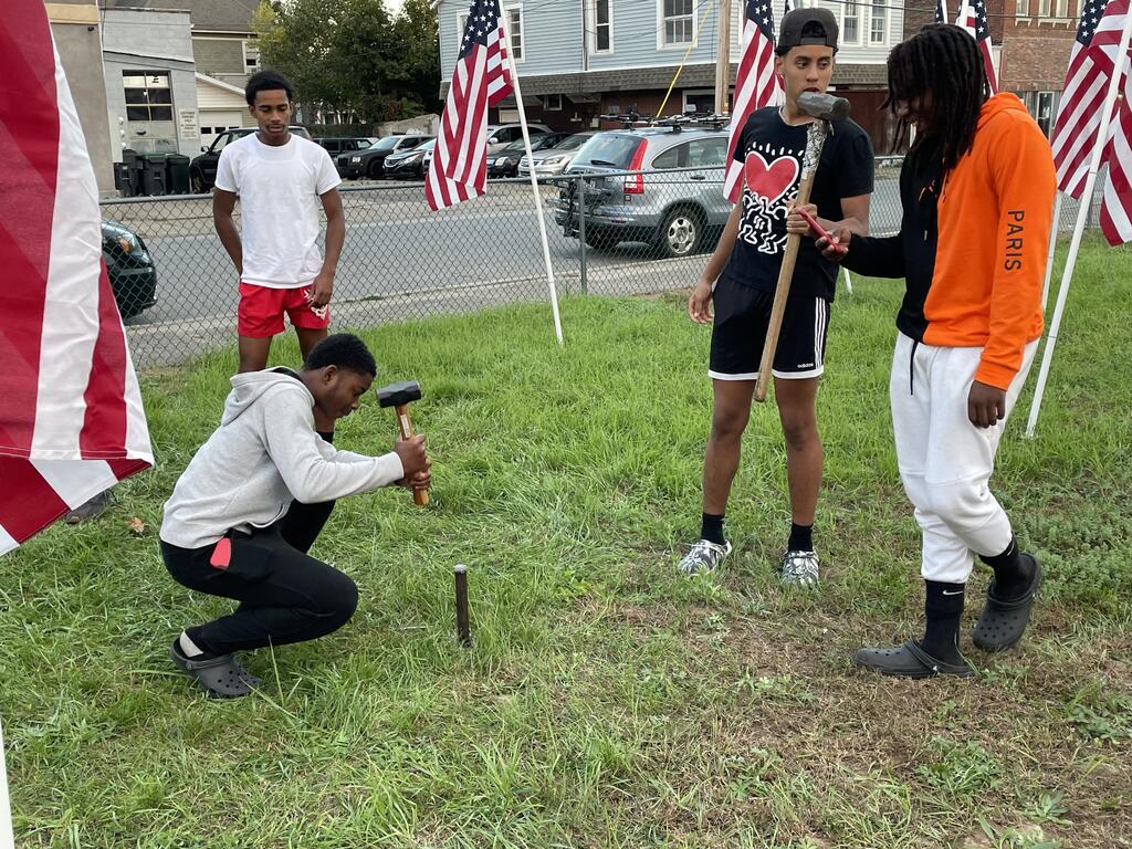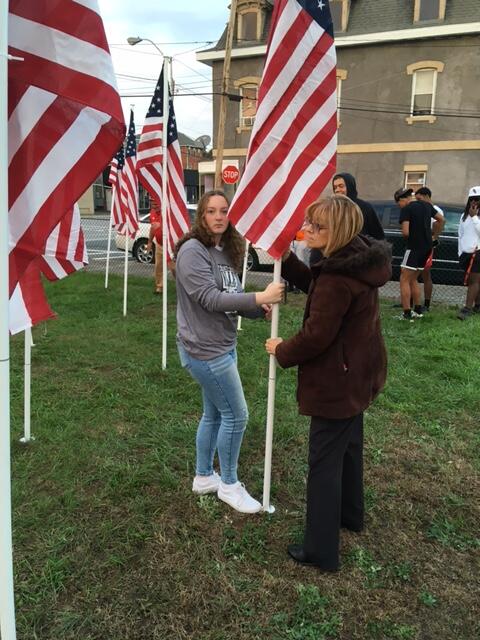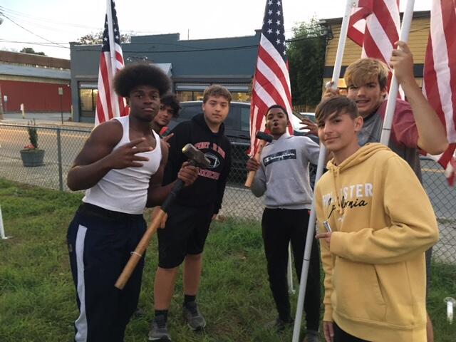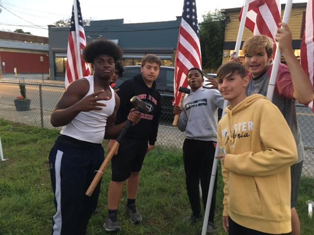 With the fast approaching dedication event scheduled for 11:00 AM Saturday, November 13th, a group of Port Jervis students helped pound stakes into the ground and set up United States flags in the lot on the corner of Fowler Street and Jersey Avenue for the Rotary Club’s “Flags for Heroes.”