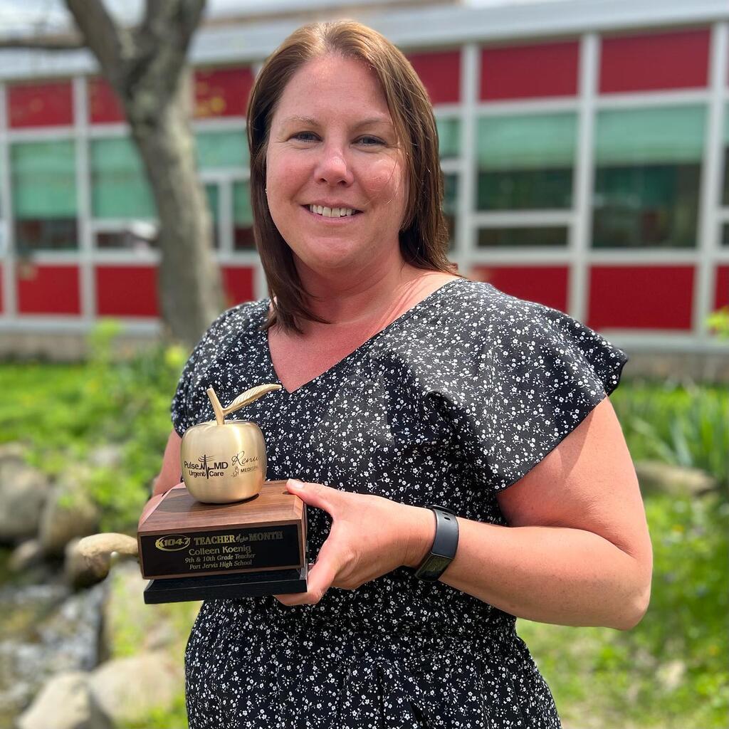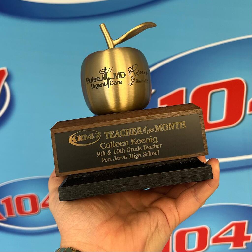 to Colleen, our Teacher of the Month! A HUGE thank you for helping to shape the next generation and shout out to Renu Medispa and Pulse-MD Urgent Care for sponsoring the award! Listen to our call with Colleen at: https://www.k104online.com/teacher-of-the-month/ and hear how she's impacting the lives of her students every day! #goldenapple #congrats #teacherofthemonthPort Jervis High School"