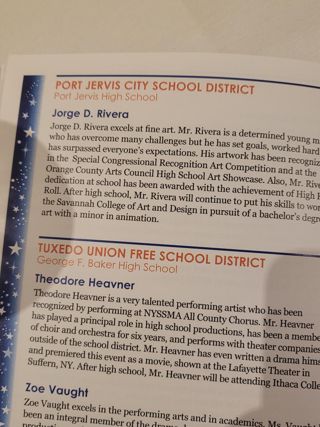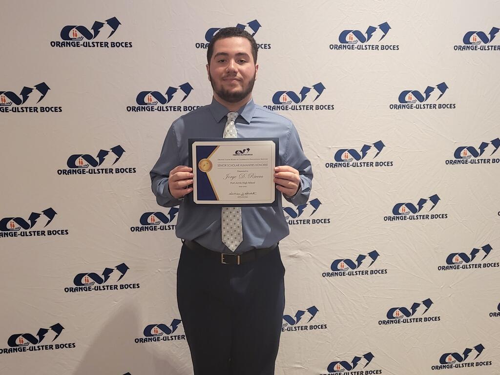 Thirty-four high school seniors from around the county who have distinguished themselves in the arts and humanities during their high school careers were selected as their district's Humanities Honorees for the 22/23 school year. These students are chosen for their outstanding accomplishments in the fine arts, theater, music, fashion, and jewelry design. The Senior Scholar Humanities Honors Awards Program is coordinated each year by the Orange-Ulster BOCES Division of Instructional Support and supported by the New York Schools Insurance Reciprocal (NYSIR). Port Jervis' winners from the Class of 2022 are Jorge (JD) Rivera, Jr. (pictured) for art and Braeden Ross (unable to attend the ceremony) for music. The Port Jervis learning community wishes them continued success in their future endeavors.