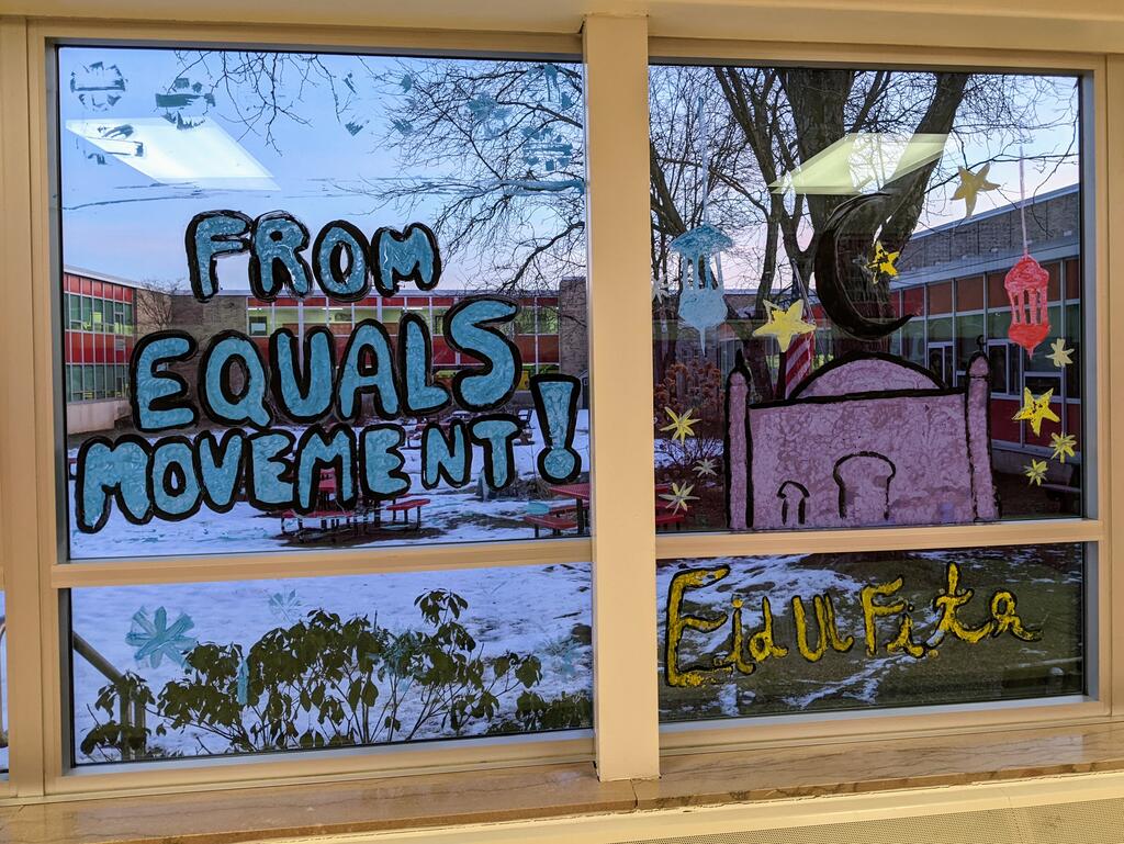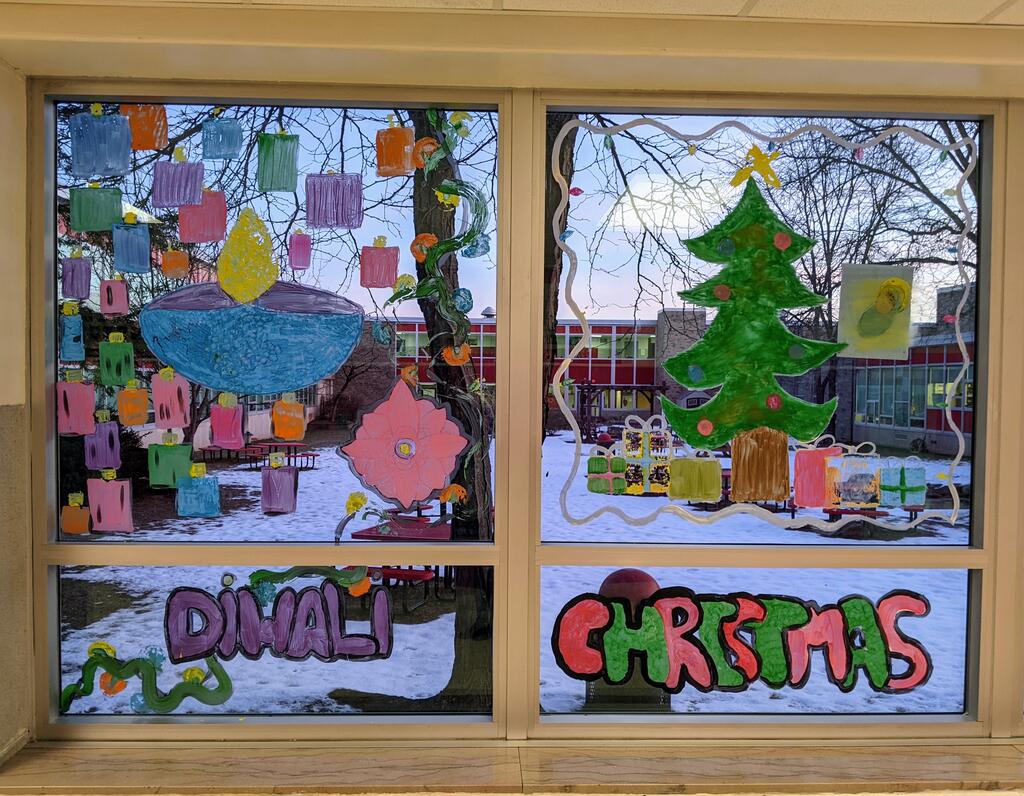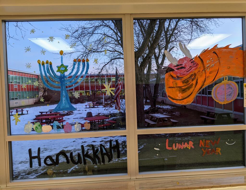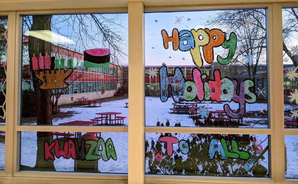 The Equals Movement is a group of students from Port Jervis High School who look to celebrate diversity and promote awareness. To help spread some cheer to students and staff who celebrate various holidays this time of year, the Movement decorated the windows in the gym hallway to represent some of the major holiday celebrations that take place in our country and around the world. The Equals Movement invites you to learn about the holidays and traditions of others and would like to wish everyone a happy holiday season!