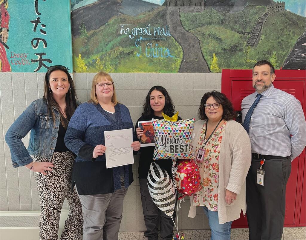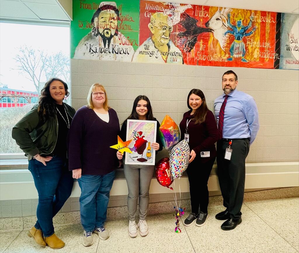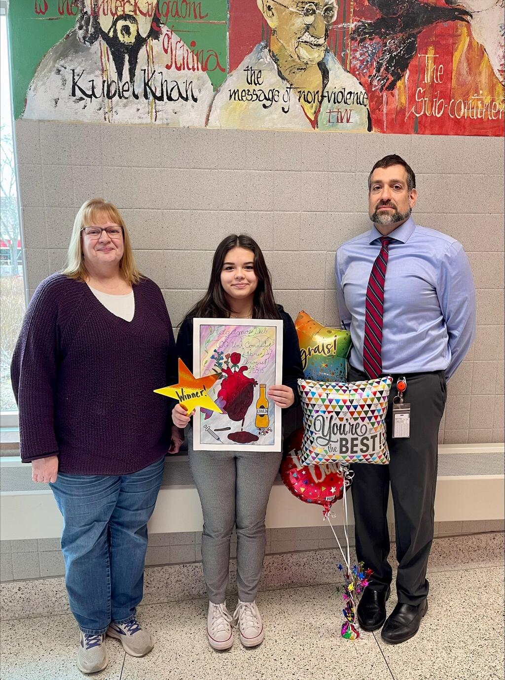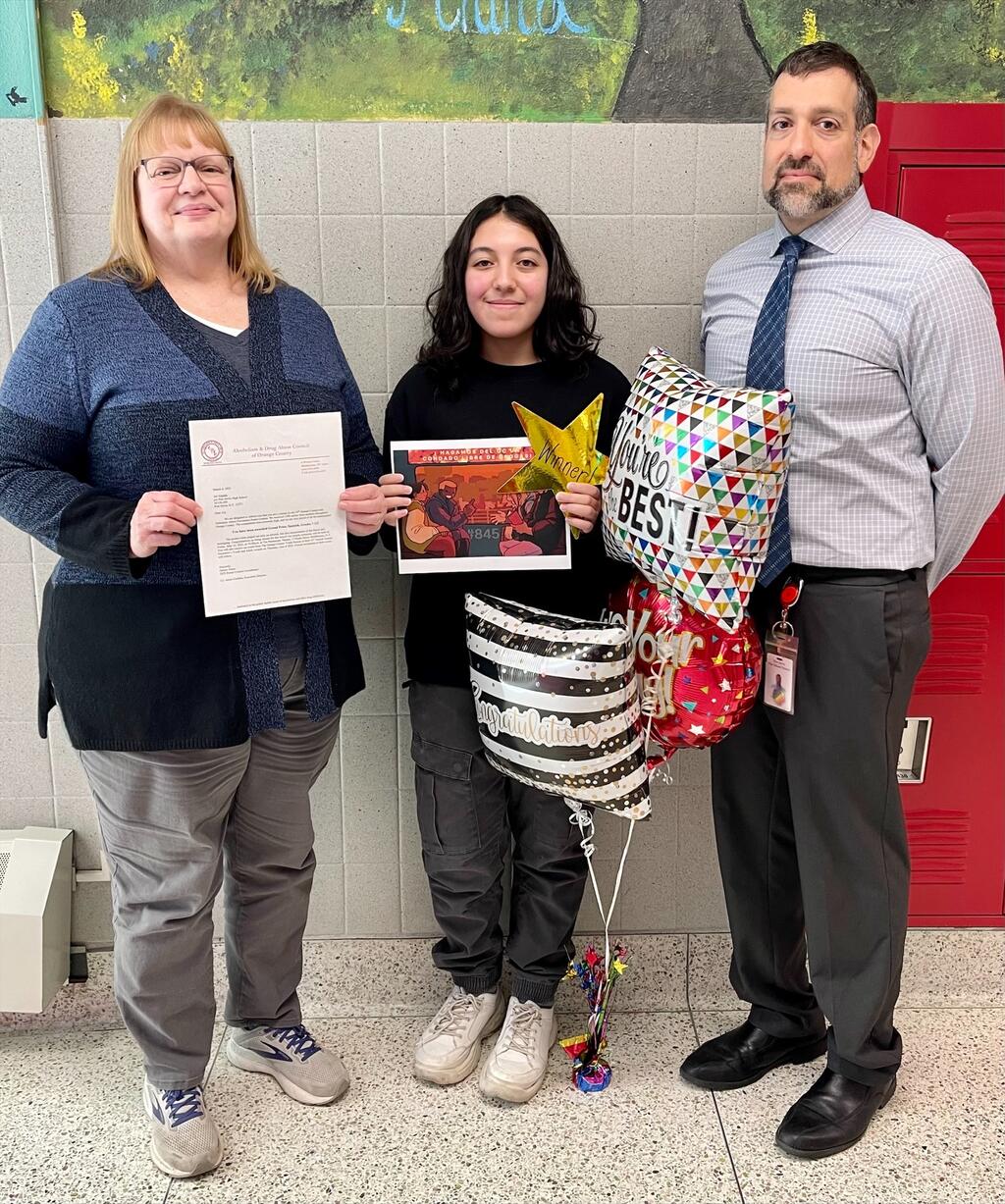 The ADAC Prevention Coordinator, MaryAlice Kovatch, Program Assistant, Denise Hulse, and Orange County STOP DWI & Traffic Safety Program Educator Lauren Savino, joined by PJHS art teacher Mrs. Horst and principal Mr. Lazzaro, surprised the girls at school. Both Ari and Karys will be honored at the ADAC awards ceremony on May 12th! In addition to our winners, the high school also would like to congratulate the following students who participated: Freshman Michael Manning, 1st place, grades 7-9, Junior Katrina Kranik, 2nd place, grades 10-12, Freshman Damien Benson, 3rd place, grades 7-9.