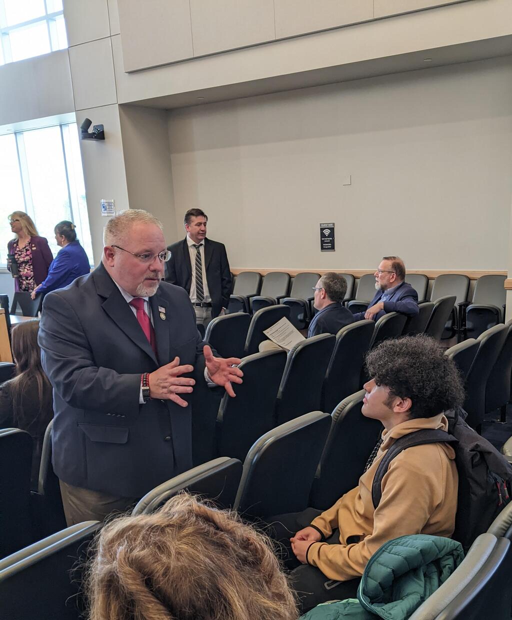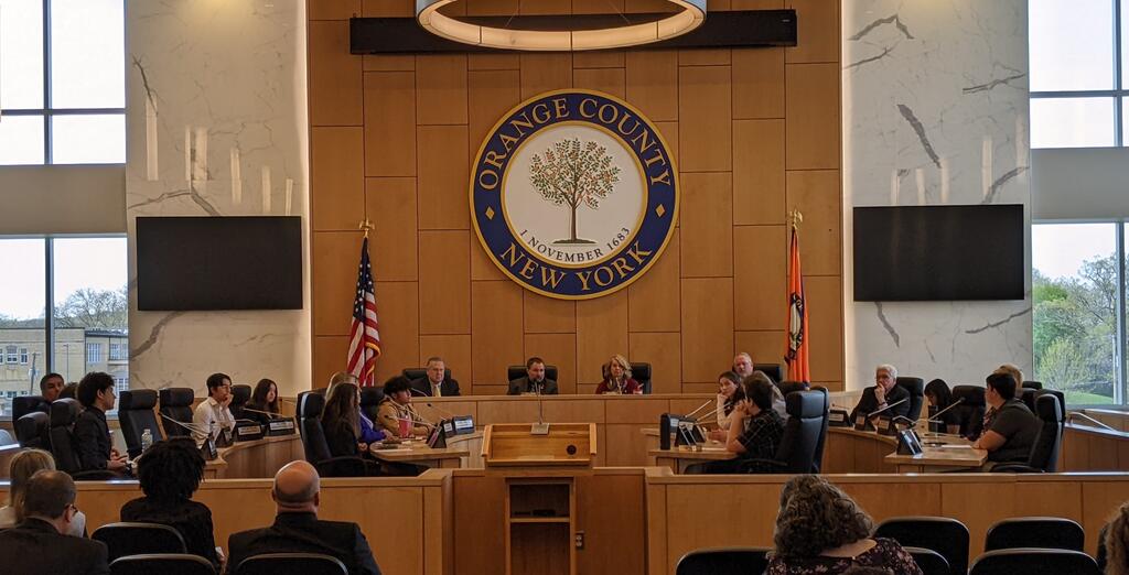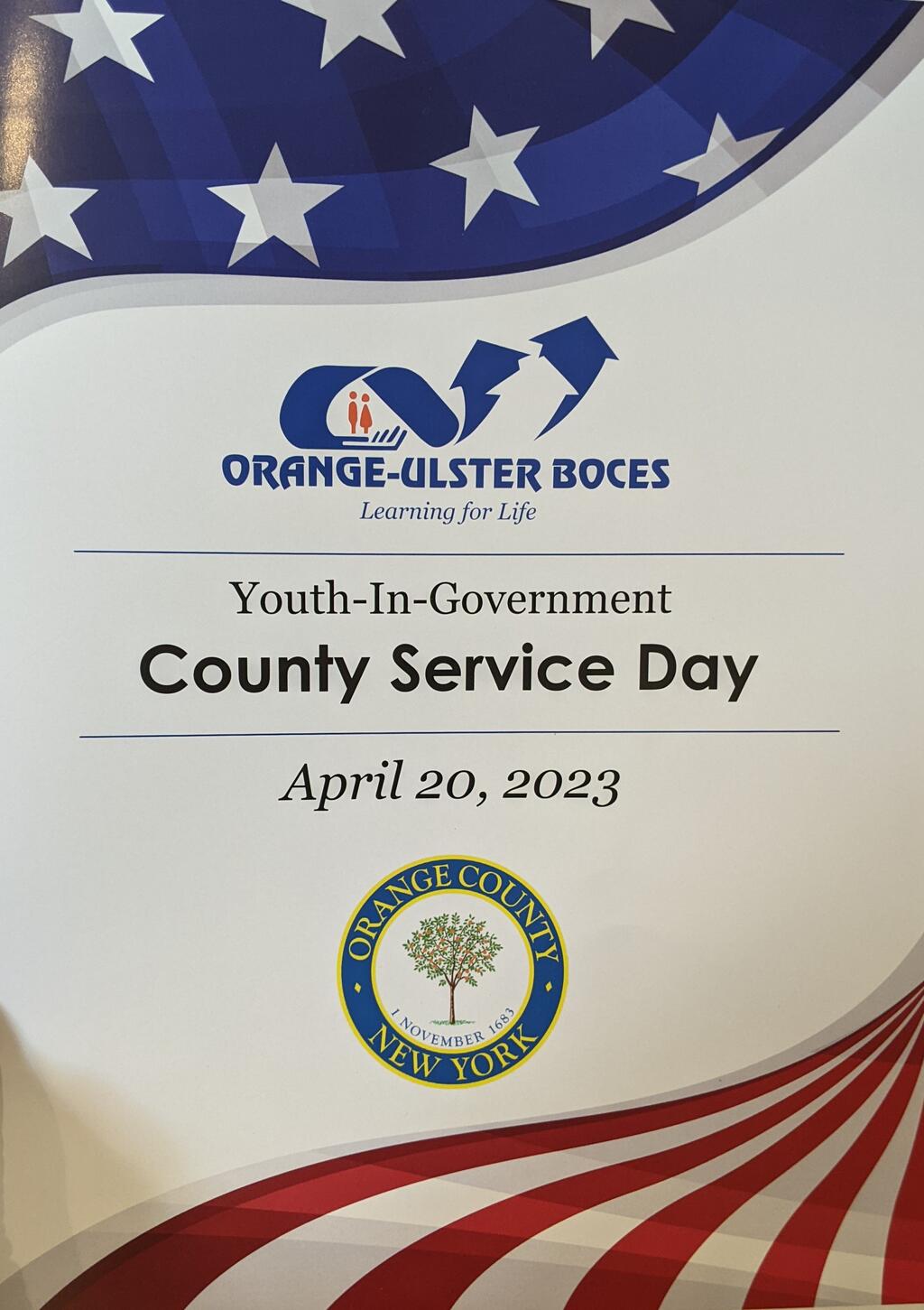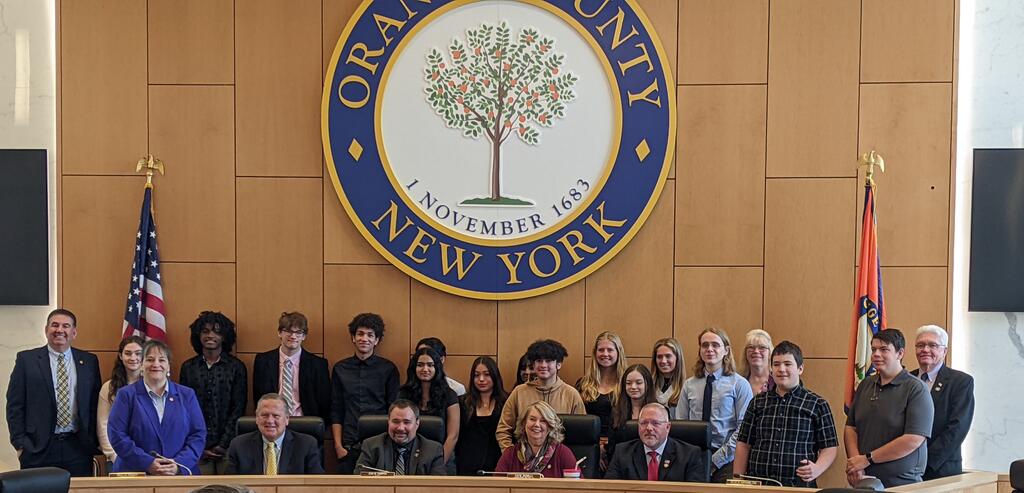 The Port Jervis High School Youth in Government Club advised by HS Social Studies teacher Mrs. Piscitelli and HS Librarian, Mrs. Perkowski, had a fantastic year this year. Sponsored by OUBOCES and supported by the Orange County Youth Bureau, Youth in Government has participants from districts all around our country with the goal of getting students interested in active government participation. This year, 3 of our students ran in the YIG elections, vying for mock offices that exist at our local, state, and federal levels. These three students, Noemie Florant, Ellis Startup, and Landon Paperstian all had to prepare speeches to give to their parties delegates at a convention, win the primary, and record a speech for the general election. The speeches were watched in Social Studies classes all over the county and thousands of Orange County students voted in a mock election. While Landon did not win his race, we are proud to announce that Ellis won for NYS Assemblyman and Noemie won the Governor's office! All three of them, as well as two other students, Aidyn Sotello and Jessica Sang, who had leadership roles in the committees, attended the Orange County Government's Day of Service and luncheon in Goshen this past week. For more information about the day and additional photos, please visit www.facebook.com/OrangeCountyYB.