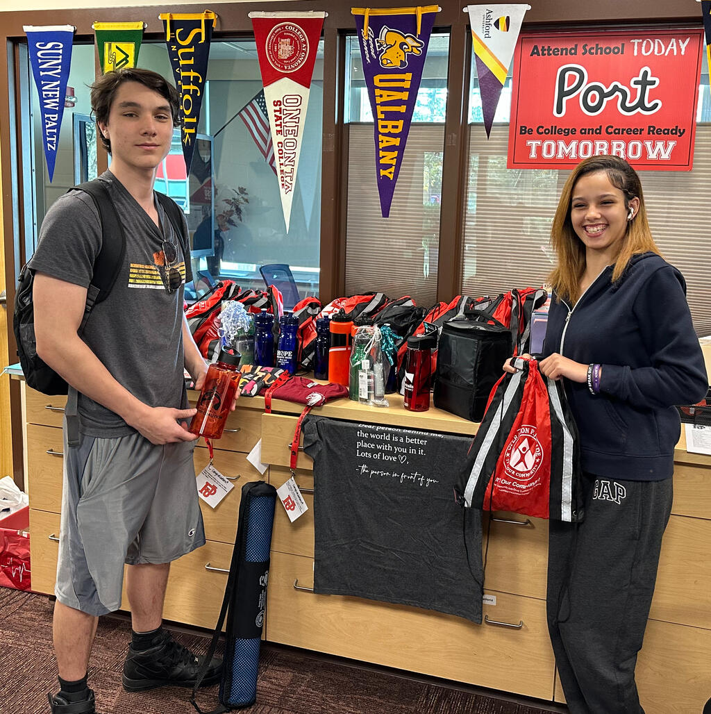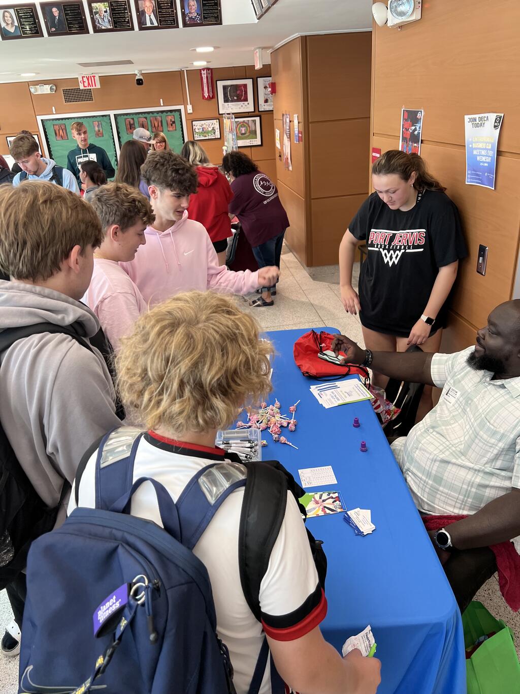 The Port Jervis High School and Middle School hosted a Wellness Resource Fair on Wednesday, October 4th. Jennifer Grimer, PJHS Social Worker, Deanna Perez-Ruiz, PJCSD Health & Physical Education Coordinator, and Erin Lehn, PJMS Social Worker, all worked to bring community resources and agencies to the student community during lunch periods. The goal for the day was for community agencies to share resources and information with our middle and high school students in an effort to support their overall social, emotional, and behavioral well-being. Students were given a 'passport' to have stamped in order to promote engagement. A stamped passport was then entered into a raffle drawing for miscellaneous prizes all donated from various sources, including school staff and the participating agencies. 68 students won prizes that day! We'd like to thank those who participated: ADAC, Fearless!, nutritionists from Bon Secours, Catholic Charities, OC Department of Mental Health and Department of Health, Mental Health Association of Orange County, Planet Fitness, Planned Parenthood and Victory Hill Therapeutic Horsemanship.