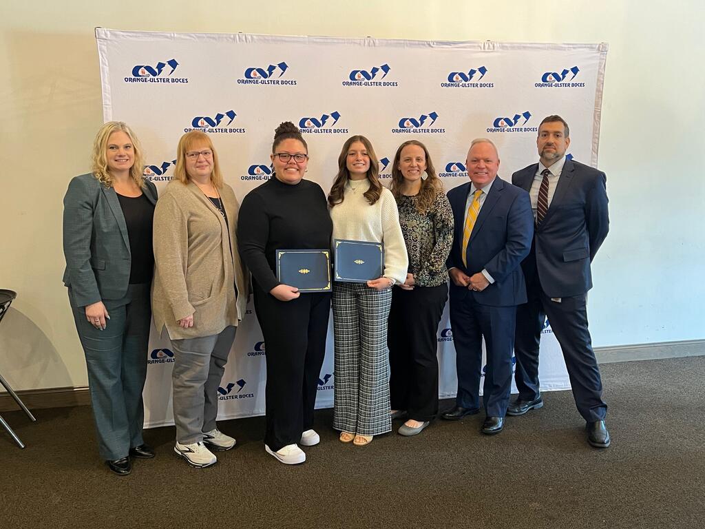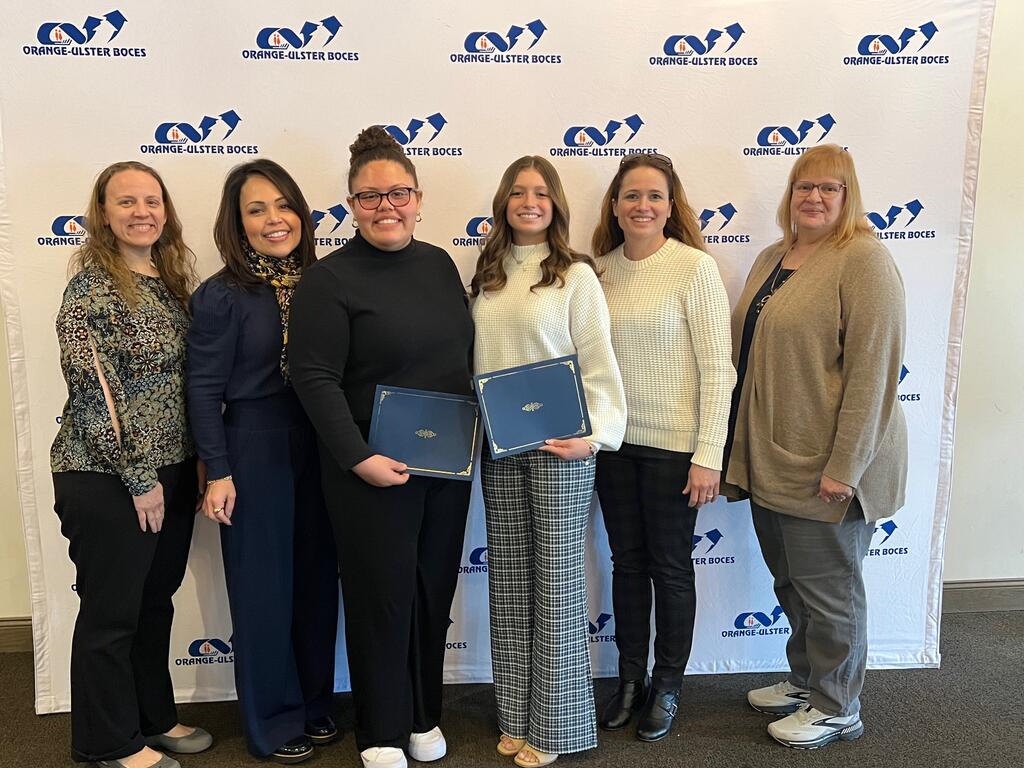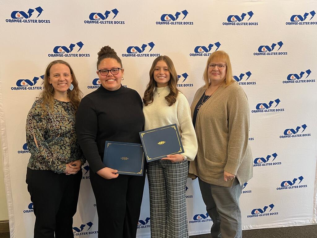 On Tuesday, 3/19 at the Country Club at Otterkill, high school Seniors who have distinguished themselves in the arts and humanities during high school were honored for their significant achievements. Students from school districts in the Orange-Ulster BOCES region were feted at the Senior Scholar Humanities Honoree Ceremony and Breakfast, an event coordinated by the Orange-Ulster BOCES Division of Instructional Support. The students, their parents, high school principals, superintendents, and BOCES administration were invited to celebrate the students’ outstanding accomplishments in the fine arts, performing arts, and the humanities. This year, Port Jervis is pleased to announce that our humanities winners are Elleanna R Sotelo for music and Kacie M Lynch for art. The students are pictured with their respective teachers (Dana Long, instrumental music and Eleanor Horst, art) their mothers, high school principal Anthony Lazzaro, Assistant Superintendent for Instruction, Dr. Natasha Walkowicz, and Superintendent of Schools, Dr. John Bell.