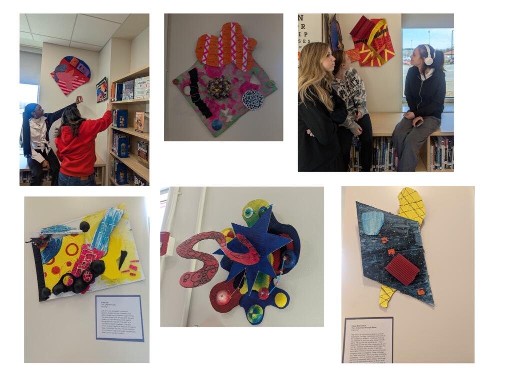 Students in Mrs. Maloney's Painting II and IV classes created painted sculptures that originated from a core experience, concept, or emotion. The wall sculptures of Frank Stella, who is based in the Hudson Valley, were a source of inspiration since he is a master at asymmetrical balance. The only parameters set by Ms. Maloney were to use a limited color scheme and maintain asymmetrical balance. The rest of the project was up to the students to design and build. Students began with a series of sketches, followed by a small-scale model and then "dumpster dove" for cardboards of different textures and thickness to use for the base shapes. They experimented with different surface paint textures, using a comb, wire, glossy paint, spray paint, and 3-D paint and conducted multiple peer critiques, refining the sculptures through them with the goal of communicating the complexity of the human experience. Students then wrote descriptive blurbs to go along with their artwork and hung each piece in the high school library at a "gallery opening" where members of the high school community were invited to look at the work and hear from the artists.