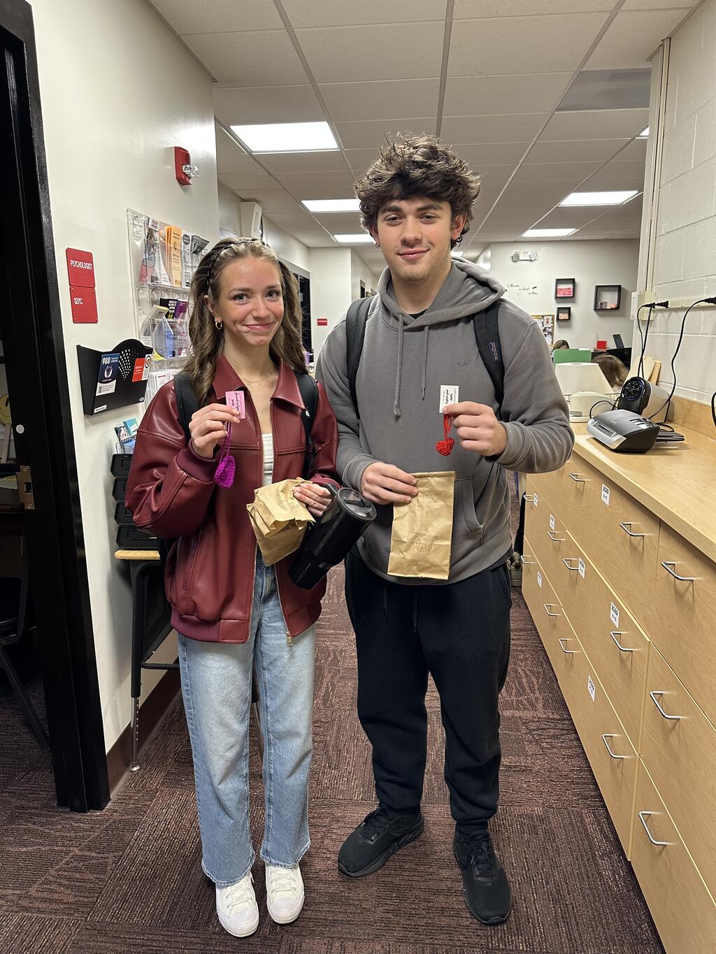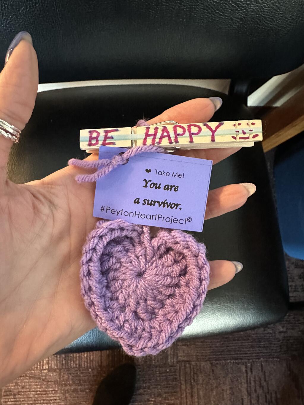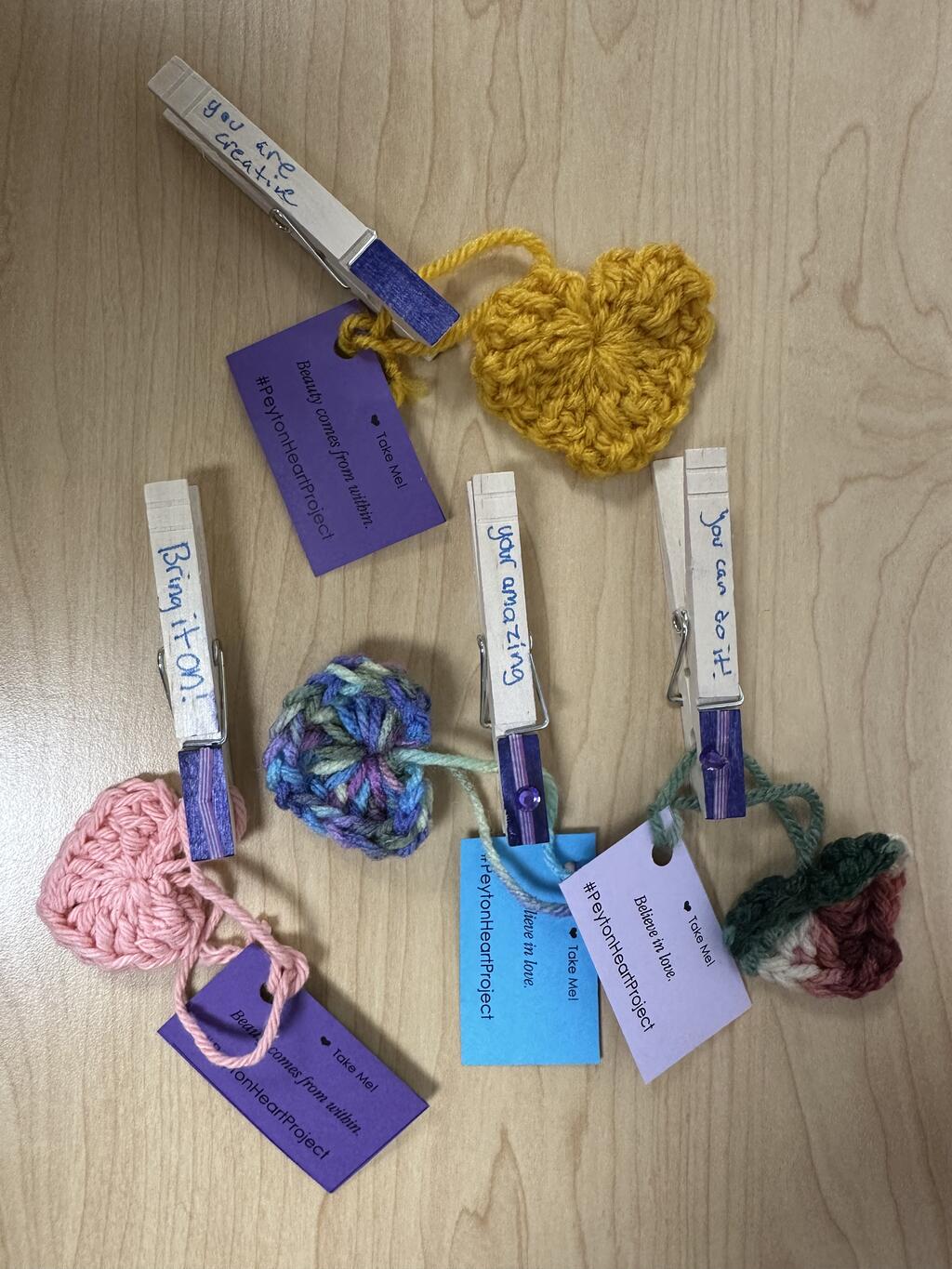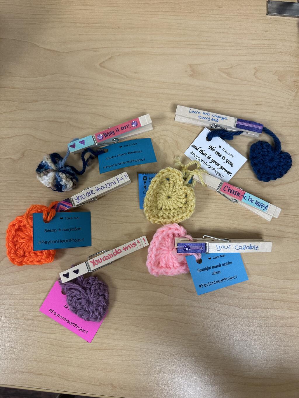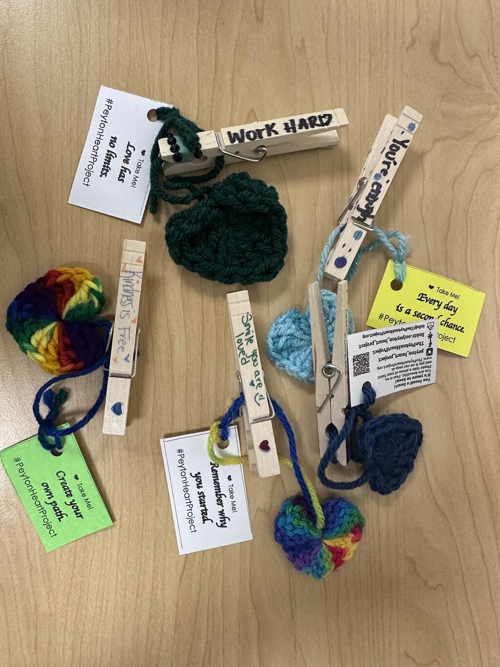 Recently, members of the Port Jervis Youth Coalition (PJYC) recognized World Kindness Day by spreading positivity and cheer. Members randomly pinned clothespins decorated with special uplifting messages onto classmates. Additionally, each pin had a heart attached to it from the Peyton Heart Project. The Peyton Heart Project's mission is to raise awareness about suicide, bullying, and to help end the stigma surrounding mental health issues. The unique crochet hearts themselves had a tag with an uplifting message and resource information.