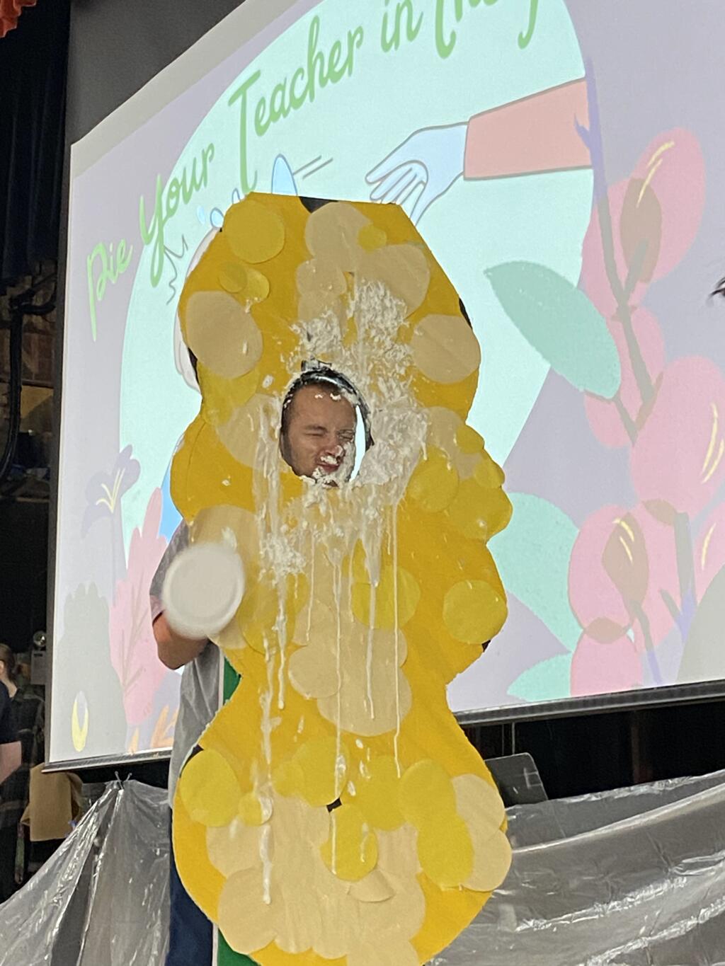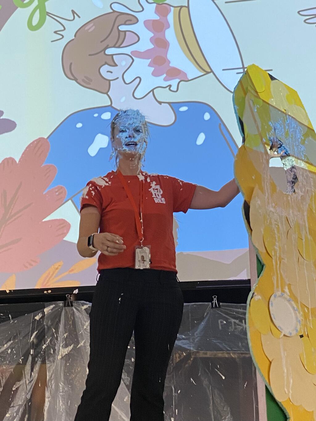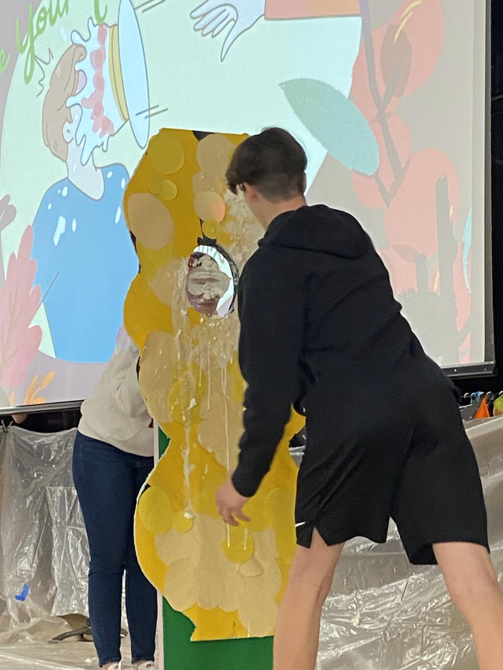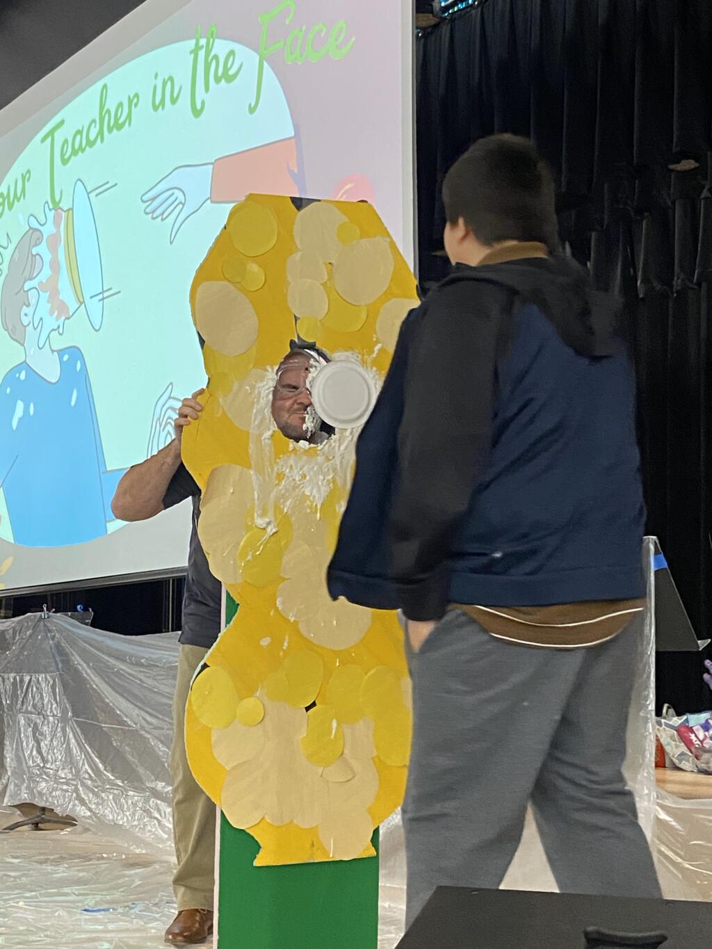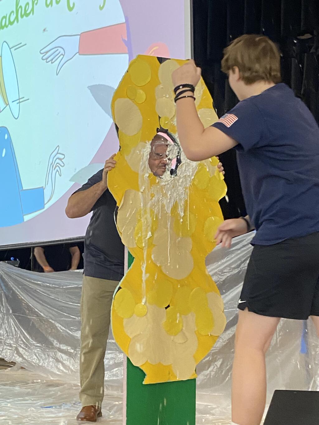 PJMS students earned the opportunity to pie a teacher or principal in the face. Class equity money earned through the Character Education Program could be redeemed for this special opportunity. Thank you to all of the teachers and Mrs. Cook for your participation.