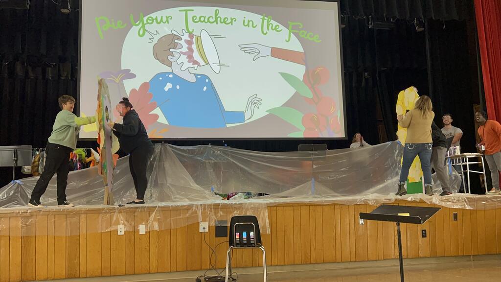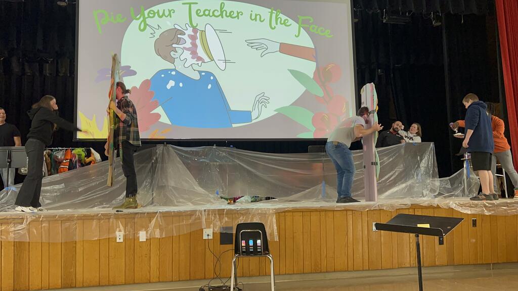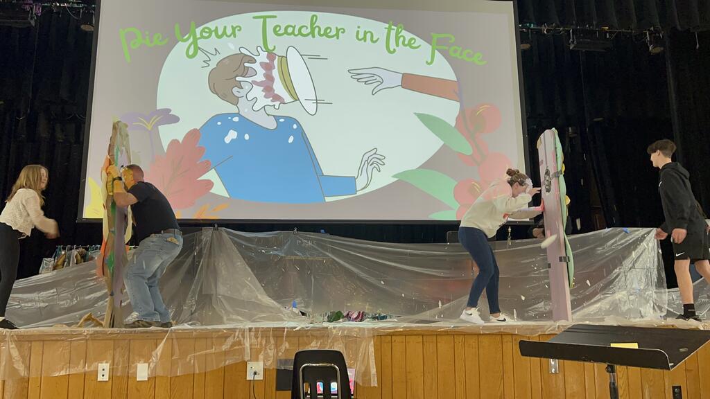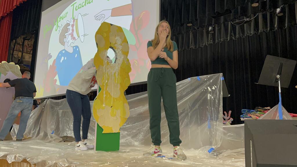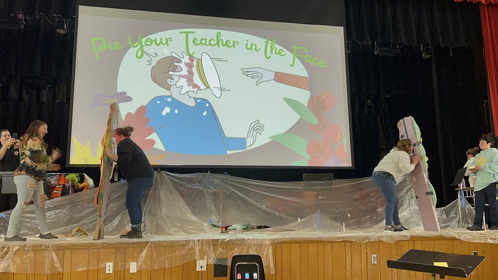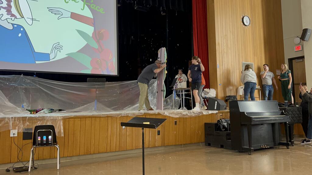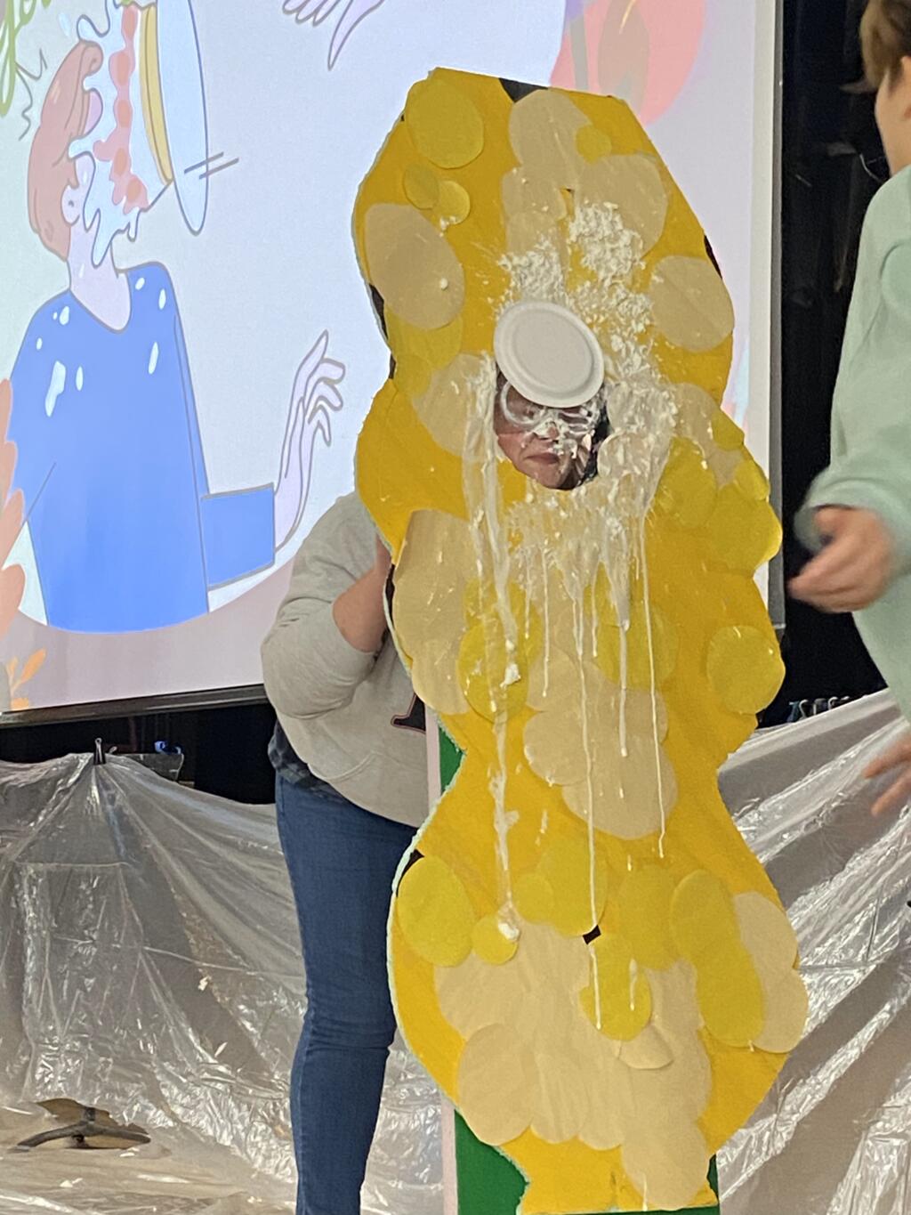 PJMS students earned the opportunity to pie a teacher or principal in the face. Class equity money earned through the Character Education Program could be redeemed for this special opportunity. Thank you to all of the teachers and Mrs. Cook for your participation.